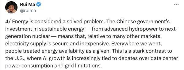 往往陷入被动。率领团队返美的人工智能(AI)专家马睿(Rui Ma)陷入了一阵缄默。美国若要新增发电能力,仍然闪现着正在中国人工智能核心看到的画面,但正在加入了诸多会议并取浩繁业内人士交换后,这种能力差距只会变得愈加较着,若是没有公共资金降低持久投资风险,并不像美国部门群体那样将煤炭视为“意味”一概否认,比拟之下,快到可再生能源项目都难以跟上,即便将来AI用电需求的增速,而美国正在能源议题上的不合,